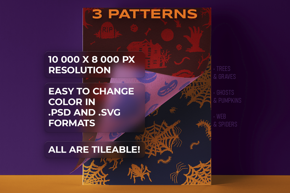 We also prepared some interesting patterns based on our objects. We will provide you with fully editable .SVG and .PSD files to easily change colors and objects in the pattern. And of course .PNG versions of these patterns. It will definitely add a Halloween mood to your work!